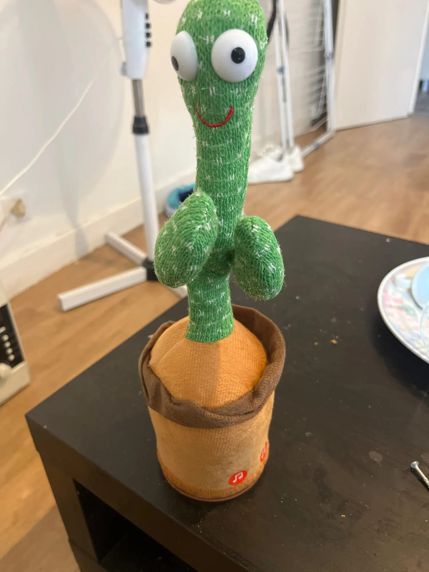 Dancing Cactus bought to give to my beloved daughter, it works really well. It comes with a small English poster explaining that the cactus has two buttons; the left button allows you to record a message by holding it down, and the right button plays diverse and varied music including the famous 'Happy Birthday'. The cactus was delivered super quickly and it comes with a USB cable to charge the dancing cactus which doesn't require any batteries at all. I really recommend it, I even think I'll reorder soon.